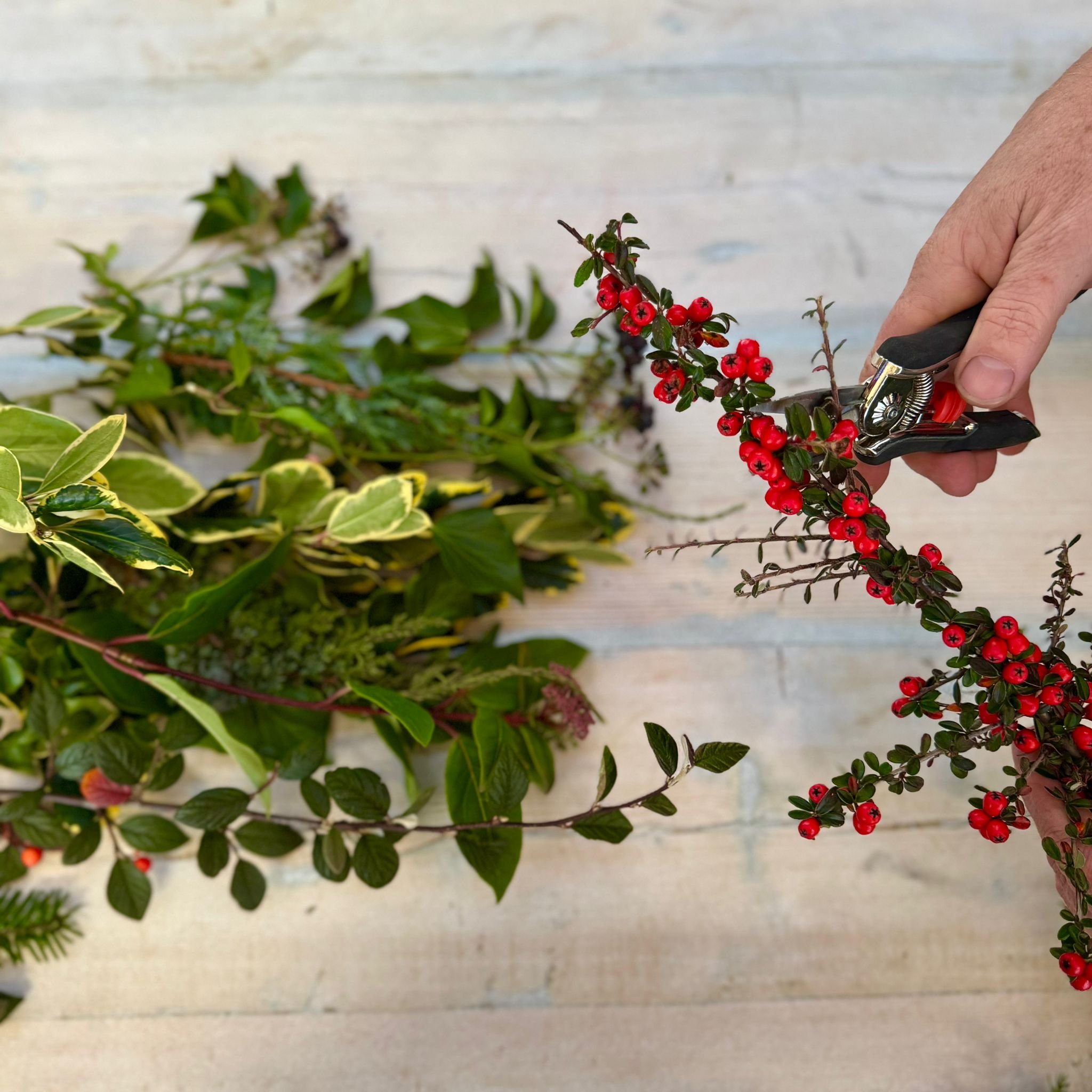 Trim each piece to short, neat lengths. Sort them by type. Keep bold pieces like holly and berries for the top layer.