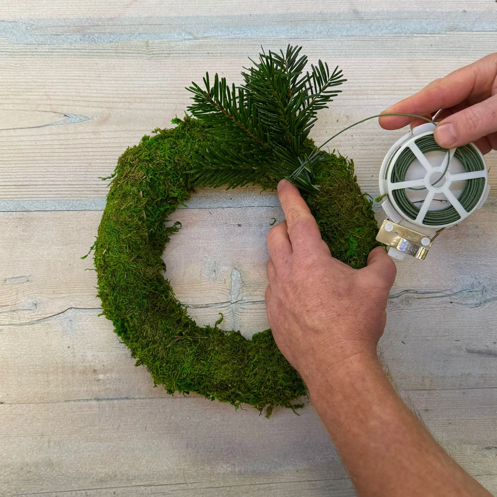 Pick a sturdy ring. You need a strong base because fresh foliage gets heavy. It also holds wires and stems in place, which makes the whole wreath easier to build and hang. You can use willow, hazel, or a wire frame. If you want a ready start, we have plain moss-look rings made from recycled material at the garden centre. They hold moisture and help your wreath stay fresh.